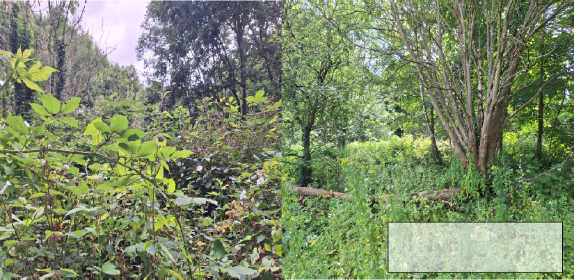A great deal of undergrowth (mainly brambles) which offers immense protection to insects, birds and mammals is situated central to the area.